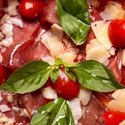 Sauce Tomate, mozzarella fior di latte, bresaola, grana padano, tomates cerises,